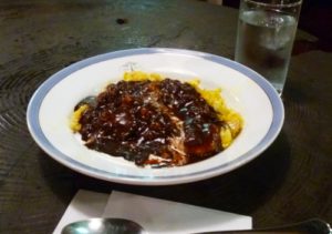 黄色と色の濃いソースのコントラストがきれいです。